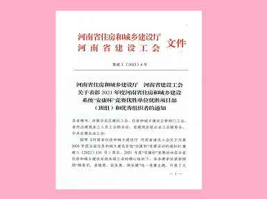272022.01九游·官方端web站入口-JiuYou j9(中国)焊工班组荣获“2021年度河南省住房和城乡建设系统‘安康杯’竞赛优胜班组”称号 -